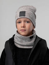 Комплект детский: шапка и снуд из полушерсти. Тёплая шапка с отворотом, украшена нашивкой из искусственной кожи. Снуд без оборотов вокруг шеи. Изделие сохраняет форму и стойкий цвет после многочисленных стирок.