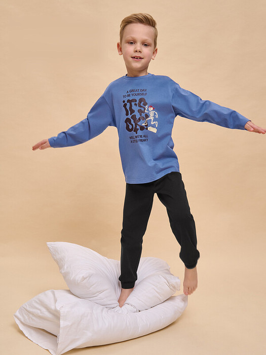 Пижама детская для мальчика. Натуральный состав ткани (100% хлопка) обеспечивает изделию мягкость, гипоаллергенность и воздухопроницаемость. Благодаря этому сон комфортный и качественный. В пижаме из хлопка ребёнку будет тепло, даже если он сбросит одеяло. Джемпер и брюки умеренного объёма, рукава широкие и свободные — комплект для сна очень удобен. В поясе и по низу брюк мягкая и широкая резинка — не перекручивается и не давит. Отделка горловины джемпера из эластичной рибаны — ребёнку удобно надевать и снимать пижаму. А также рибана сохраняет отличную форму надолго. Хлопковая пижама украшена забавным принтом в готическом стиле, надписи переводятся: «хороший день, чтобы быть собой», «всё окей!», «все мы немного странные». Фишка модели — принт светится в темноте! Такая особенность непременно понравится любому ребёнку. Детская пижама для мальчика неприхотлива в уходе. Принт эластичный и мягкий, без проблем переносит частые стирки. Детская пижама с брюками подходит для сна как дома, так и в детском саду — отличный выбор для вашего ребёнка! Помните о правильном уходе за изделием: рекомендуется стирать при температуре не выше 30 °C, без предварительного замачивания, с изнанки. Это поможет сохранить качество и цвет пижамы на длительное время.