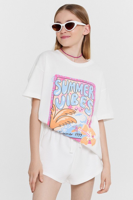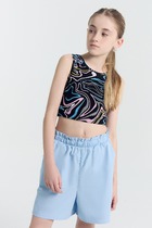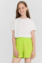 Шорты для девочек. Шорты укороченные, с высокой посадкой. Пояс цельнокроеный с эластичной тесьмой внутри. Снаружи пробиты петли и втянут шнур 8PXС-2. В боковых швах кант из трикотажного кулирного полотна. Нижние срезы шорт обработаны швом в подгибку.
