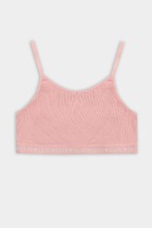 Бюстье из трикотажной кулирки. Горловина округлой формы. Спинка фигурная, как в спортивном топе. Все срезы окантованы бейкой из основного полотна. По нижнему срезу настрочена жаккардовая эластичная тесьма.