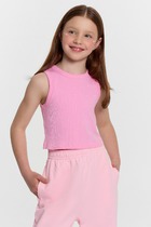 Топ для девочек прилегающего силуэта. Горловина круглая. Проймы и горловина окантованы бейкой из основного полотна. Низ изделия обработан швом в подгибку.