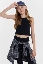 Топ для девочек прилегающего силуэта. Горловина круглая. Проймы и горловина окантованы бейкой из основного полотна. Низ изделия обработан швом в подгибку.