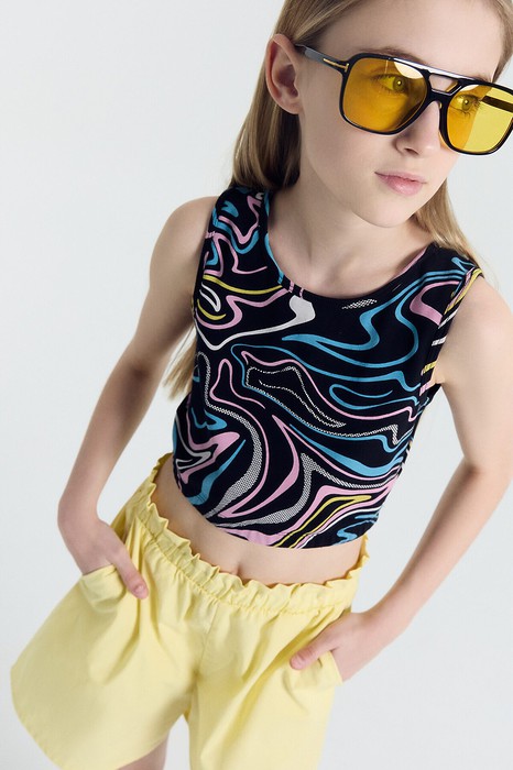 Топ прилегающего силуэта из трикотажного полотна кулирного переплетения. Горловина круглой формы, рукавов нет. По низу изделия проходит эластичная тесьма. Рекомендуем!