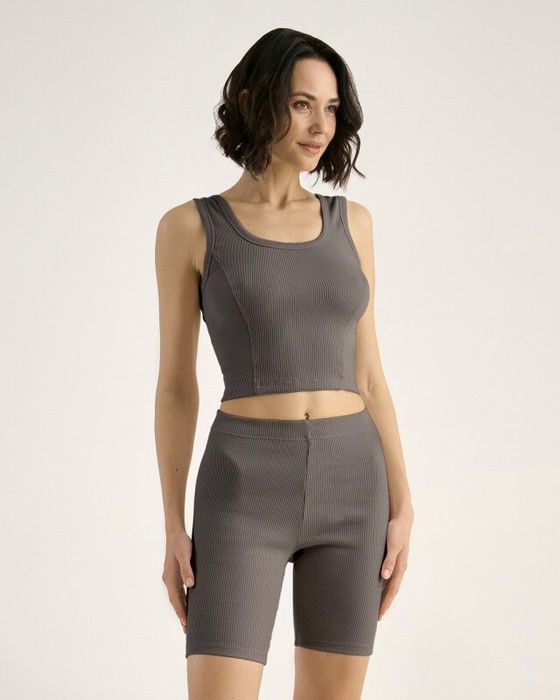 Майка из кашкорсе, облегающая с отстроченными рельефами. Горловина и проймы окантованы основной тканью