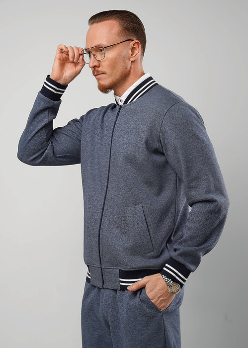 Мужской бомбер на молнии из жаккардового трикотажного полотна. Дизайн модели дополнен имиджевой фурнитурой. Прорезные карманы, эластичные вязаные манжеты и пояс добавляют удобства в носке. Стильное решение для похода на учебу или работу.