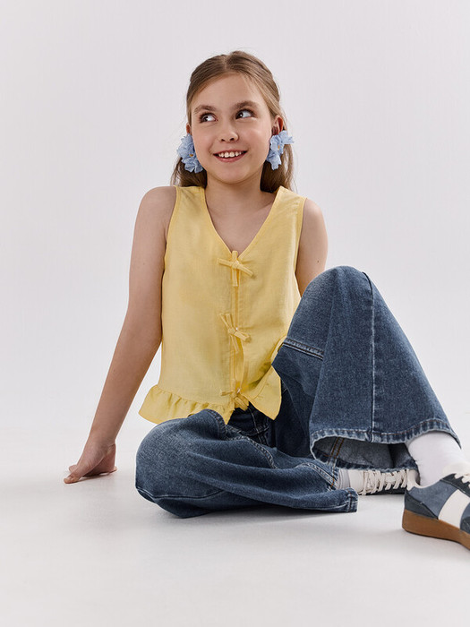 На передней детали настрочены декоративные бантики из основного полотна . Края горловины и проймы обработаны бейкой из основного полотна. По низу изделия - рюша.