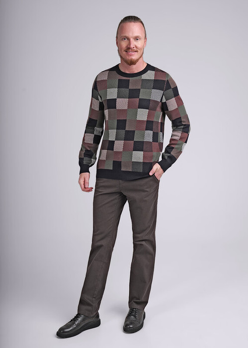 Мужской вязаный клетчатый джемпер свободного силуэта с круглым вырезом горловины и длинным рукавом. Джемпер выполнен из смесовой пряжи с хлопком. Изделие подойдет к любому низу и согреет в прохладную погоду.