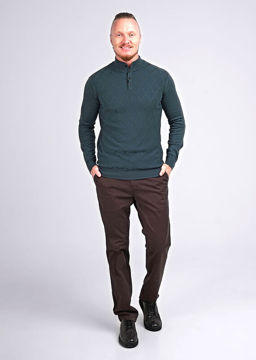Мужской джемпер с воротником стойка на пуговицах, с длинным рукавом. Модель связана из приятной хлопковой пряжи с добавлением акрила с вывязанным геометрическим рисунком по полочке. Изделие можно сочетать как в классическом стиле, так и в повседневном.