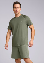 Базовая однотонная футболка стандартного объема с круглой горловиной, втачным рукавом из хлопкового полотна с добавлением эластана. Является неотъемлемой частью мужского гардероба.