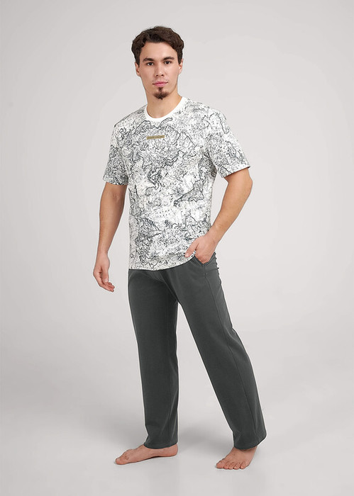 Комплект мужской состоящий из футболки и брюк. Футболка из трикотажного полотна в набивку с коротким рукавом и дизайнерской нашивкой. Брюки из трикотажного полотна на широком поясе с резинкой и регулируемым шнуром, по бокам удобные карманы.