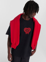 Фуфайка с коротким рукавом среднего объема, с оригинальным принтом, круглым вырезом горловины, которая оформлена обтачкой из рибаны.