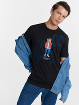 Фуфайка с коротким рукавом среднего объема, с оригинальным принтом, круглым вырезом горловины, которая оформлена обтачкой из рибаны.