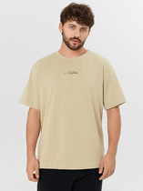 Фуфайка с коротким рукавом среднего объема, круглым вырезом горловины, которая оформлена обтачкой из рибаны.