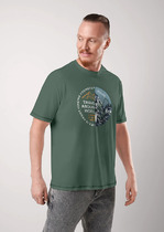 Нижние срезы футболки и рукавов обработаны швом вподгибку.