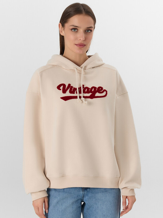 Худи изготовлен из трикотажного полотна футер 3х нитка с подчесом. Худи свободного силуэта. Горловина круглой формы с капюшоном. Капюшон со средним швом на подкладке из кулирки. С внешней стороны пробиты петли и втянут шнур (8КXW-1) с завязвнными концами. Рукава втачные, длинные. Плечо спущено, пройма углублена. По низу рукава отрезная манжета из рибаны. По плечу отрезная декоративная деталь. По низу худи отрезной пояс из рибаны. Шов втачивания обтачки и рукава, плечевые, шов притачивания пояса распошиты.