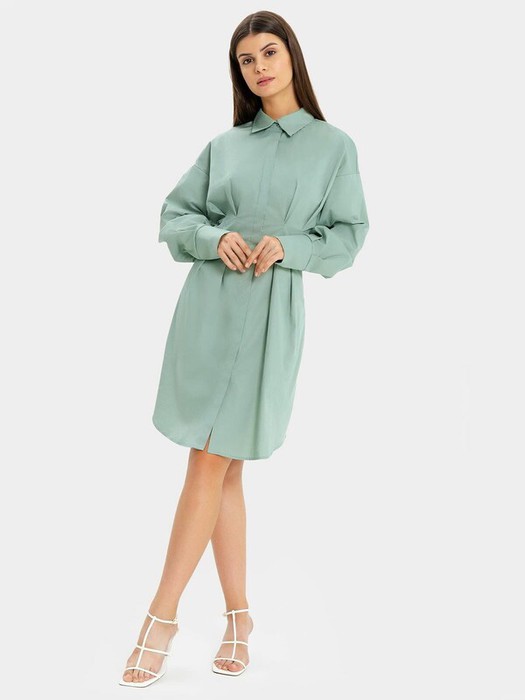 Текстильное платье мини женское полуприлегающего силуэта с фигурным низом. Перед с центральной застежкой на пуговицы. Горловина круглой формы с воротником-стойкой. Спереди и сзади заложены складки, подчеркивающие талию. Линия плеча спущена, длинные рукава заканчиваются широкими манжетами.