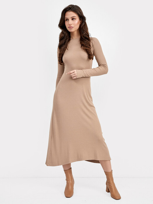 Прилегающее женское платье длиной ниже колена. Выполнено из трикотажной рибаны – в рубчик. Вырез круглый, с чуть удлиненным воротником. Рукава узкие, слегка удлиненные. От линии бедер платье расширяется и завершается асимметричным нижним краем. Красиво!