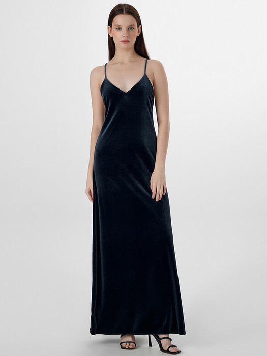 Сарафан изготовлен из трикотажного полотна велюр. Сарафан полуприлегающего силуэта, длиной макси на подкладке из кулирки. Сарафан на бретелях с регулировкой по длине на кольца (металл М008 8мм) и регуляторы (металл М808В 8мм). Горловина V-образной формы. По спинке глубокий вырез. Спинка со средним швом. Подкладка укороченная. Нижний срез обработан швом вподгибку.