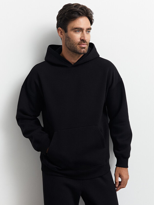 Мужское утеплённое худи свободного кроя из мягкого футера с начёсом, со спущенным плечом, длинными рукавами, капюшоном и карманом-«кенгуру» спереди. Манжеты и низ, оформленные рибаной в лаконичный рубчик, добавляют изделию текстурности и делают силуэт более графичным.