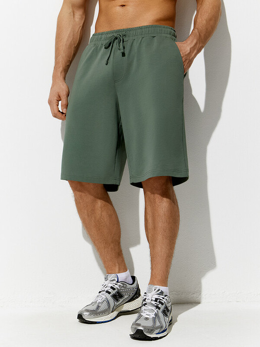 Мужские свободные шорты средней длины с боковыми карманами и поясом на резинке с кулиской.