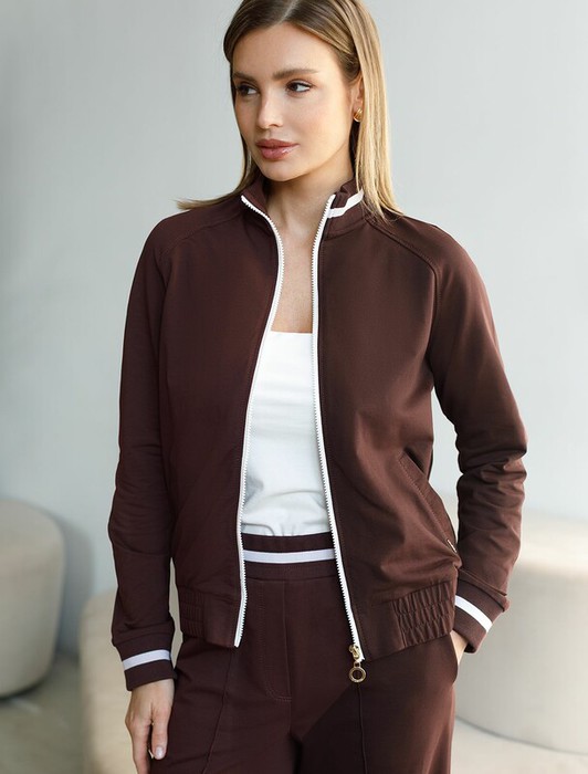 Бомбер темно-синего цвета среднего объема с застежкой на молнию выполнен из премиального футера двухнитки плотностью 240 Г/м2. Натуральный состав ткани обеспечивает дышащий эффект, мягкость и приятные тактильные ощущения, Эластичный материал позволяет свободно двигаться без стеснения, а также отлично сохраняет форму даже после длительного ношения. Гладкая лицевая сторона придает бомберу опрятный и дорогой вид. Повседневный бомбер отличается аккуратным силуэтом без лишнего объема и универсальной длиной, которая идеально подходит для повседневного образа. Манжеты на рукавах и широкая резинка по низу обеспечивают надежную посадку, сохраняя тепло в прохладную летнюю погоду. Особенность бомбера - контрастные полосы на горловине и манжетах, которые добавляют современный акцент и делают его более выразительным. Представленная размерная линейка позволяет подобрать оптимальный вариант для любой фигуры и размера, на маленький или плюс сайз, обеспечивая свободу движений без компромиссов по стилю. Этот легкий бомбер стан