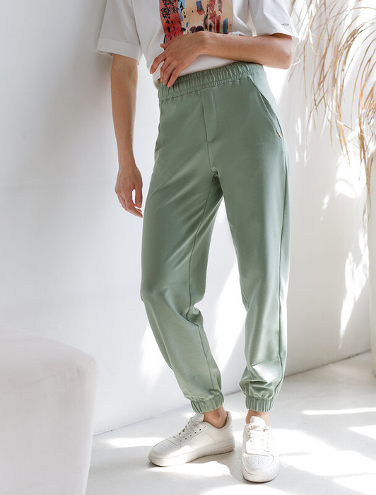 Брюки выполнены из эластичного футера двухнитки. Изделие дополнено боковыми карманами с фирменным логотипом бренда. Пояс на резинке регулируется потайным хлопковым шнурком. Эластан в составе гарантирует комфорт и формоустойчивость. Модель сочетается в костюме с свитшотом D49.072 и паркой D49.076