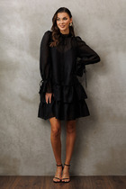Платье с объёмными рукавами выполнено из тонкого хлопкового твила. Модель с пышной юбкой хорошо драпируется, сохраняя свою форму. Женственный силуэт подчёркивает пояс на талии с регулируемым шнуром.  Украшением служит застежка на молнии с золотистой фурнитурой и логотипом бренда. Благодаря наличию эластана в составе, изделие сохранит свой безупречный внешний вид в течении долгого времени.