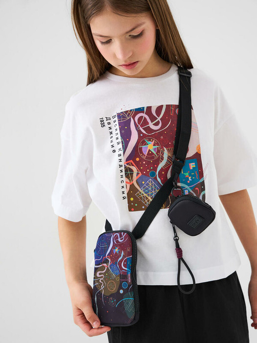 Сумка для девочки подростка. Стильная текстильная сумка кросс-боди для телефона с чехлом для наушников имеет фрагментарный принт с картины Василия Кандинского, Движение, 1935 г. (коллаборация с Третьяковской галереей). Регулируемый ремень. Основной отсек на молнии. Параметры сумки: высота - 19 см, ширина -10 см, глубина - 2 см. Параметры чехла: высота - 8 см, ширина -8 см, глубина - 1,5 см.