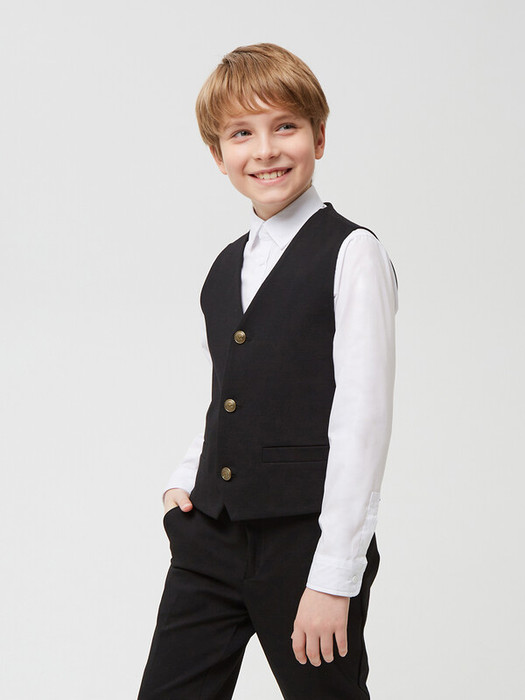 Трикотажный жилет без подкладки для мальчика с V-образным вырезом и боковыми прорезными карманами с листочкой. Спинка дополнена хлястиком с металлической пряжкой для регулировки жилета по полноте. Застегивается на три пуговицы.