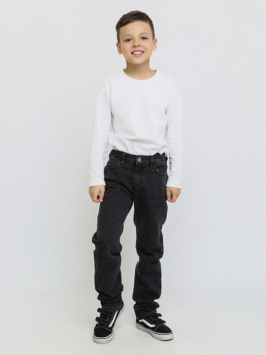 Базовые прямые джинсы со средней посадкой. Деним из натурального хлопка с добавлением эластана для максимального комфорта. Классическая модель подойдет как девочкам, так и мальчикам. Брюки будут гармонично смотреться с объемным верхом кроя оверсайз. Два прорезных кармана спереди, кармашек для мелочи, два накладных кармана сзади.