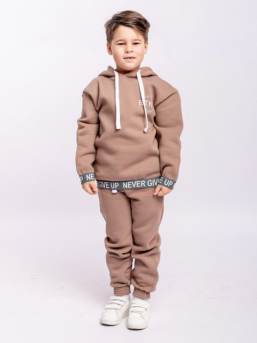 Костюм спортивный детский бежевый из футера пенье с начесом. В комплект входит толстовка с капюшоном и брюки на резинке. Ткань высокого качества, состоит на 95% из хлопка и 5% эластана, не теряет цвет и форму на протяжении долгого времени.