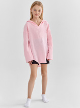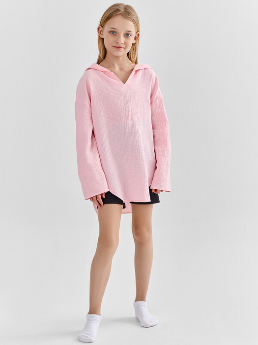 Туника для девочек свободного силуэта с капюшоном, выполнена из муслина. Горловина V-образная. Длина - ниже бедра.