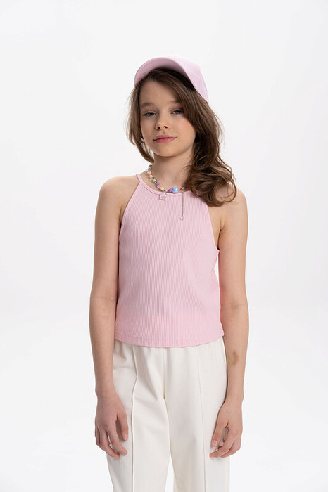 Укороченный топ-халтер из модной ткани в рубчик для девочки. В составе преобладают хлопок и вискоза – модель мягкая, приятная на ощупь и комфортная для кожи ребёнка. Эластан помогает изделию не терять форму. По горловине завязка, с её помощью можно регулировать высоту горловины и посадку топа. Топ-халтер - мастхэв этого лета. Модель подчёркивают красоту открытых плеч, рук и спины. Вырез под горло даёт дополнительный акцент на плечи и удлиняет шею. Для самых модных девочек. Сочетается с любыми объемными низами.