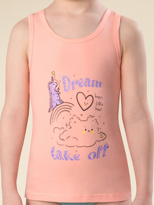Каждая мама заботится о комфорте своего ребёнка и хочет выбрать для него только действительно качественное бельё. Наша красивая майка для девочки отлично подходит под эти запросы. Модель выполнена из ткани с высоким содержанием хлопка — она приятна на ощупь, великолепно пропускает воздух, позволяя коже ребёнка дышать. Эластан помогает изделию сохранять отличную форму в течение длительного времени. Качественная ткань и правильный крой гарантируют идеальную посадку— ребёнок чувствует себя комфортно целый день. Горловина и проймы обработаны эластичным пайпингом в тон — они не растягиваются и надолго сохраняют прекрасный внешний вид. Модель представлена в трендовых оттенках "персиковый бисквит" и "голубой топаз". Персиковый и голубой - очень нежные, по-настоящему девичьи цвета. Ваша дочка будет в восторге! Майка декорирована милым принтом с дракончиком-единорогом и позитивным текстом. Перевод: "Мечтай Взлезай, счастливое маленькое сердечко".  Принт мягкий и устойчивый, отлично переносит стирки. Такая майка — идеа