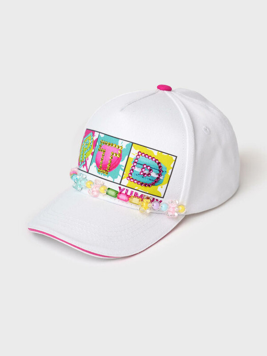 Стильная детская бейсболка для девочки. Выполнена из хлопковой ткани с классическим изогнутым козырьком. По линии шва козырька добавлена лента из разноцветных бусин, которая придаёт изделию оригинальность. Сзади — пластиковая застежка на кнопках для регулировки размера.
