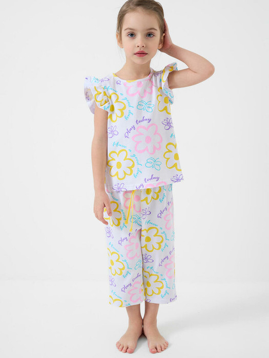 Детская пижама для девочки. Состоит из футболки, прямого кроя с короткими рукавами и бридж. Модель выполнена из мягкого, хлопкового трикотажа. Яркий принт с цветами, бабочками и надписями делает комплект весёлым и привлекательным. Рукава украшены воланами, что придаёт образу воздушность. У футболки круглая горловина с аккуратной отделкой, бриджи — на удобной резинке и с декоративным шнурком на поясе.