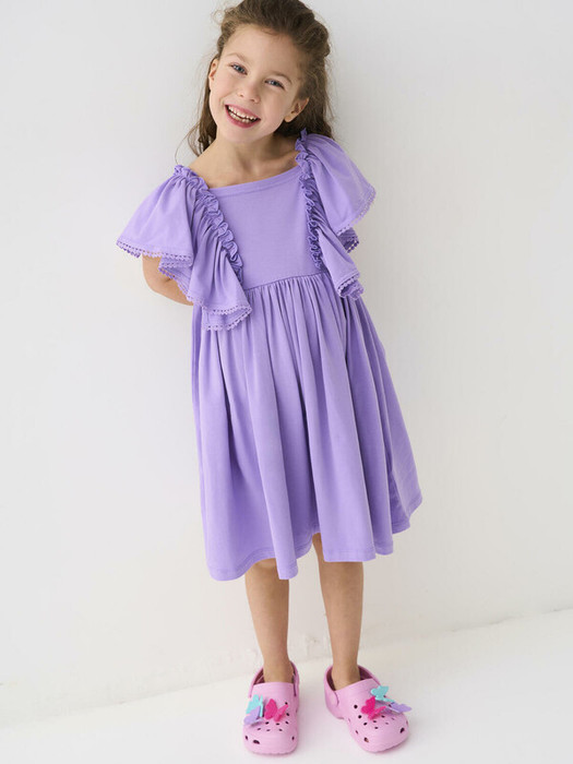 Лёгкое детское платье для девочки. Выполнено из мягкого хлопкового трикотажа джерси. Модель свободного кроя без рукавов, с аккуратной квадратной горловиной. Главный акцент — широкие рюши. По линии груди выполнена мягкая сборка, создающая комфортную посадку.