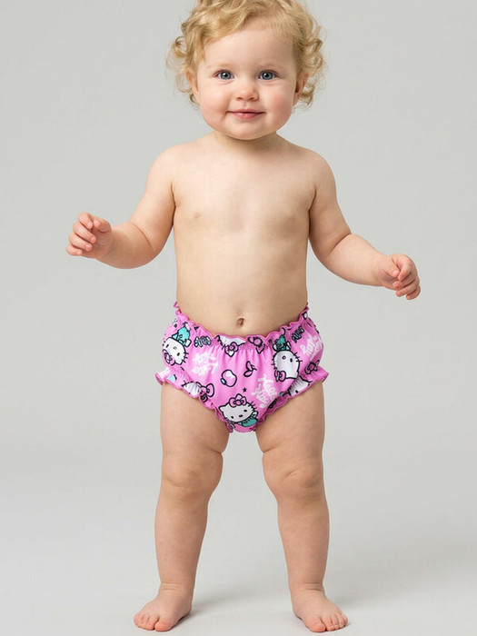Плавки детские для девочки с рисунком Hello Kitty. Выполнены в розовом цвете с весёлым принтом: кошечка Hello Kitty, конфетки, сердечки и очки. Спереди пояс украшен маленьким розовым бантиком. Плавки мягко облегают фигуру за счёт эластичных резинок в поясе и по краям ножек. Внутри — хлопковая ластовица для комфорта. Благодаря UF-защите, ткань сохраняет первоначальный вид даже при длительном пребывании на солнце. Прекрасный выбор для лета и пляжа.