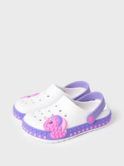 Сабо детские для девочки с единорогом. Сабо из облегченного и прочного ЭВА. Материал хорошо моется. Форма модели учитывает эргономику стопы. Модель имеет перекидной ремешок для лучшей фиксации обуви на ноге.  Благодаря вентиляционным отверстиям сабо проветриваются, ноги ребенка дышат и не потеют.