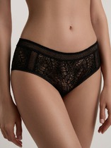 Бикини с кружевной вставкой по верху переда и кружевной спинкой со средним швом. По поясу и ножке со стороны переда обработка резинкой с фестоном. На детали переда - небольшой атласный бант.