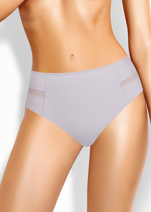 Трусы бразилиана с завышенной посадкой, сзади и сбоку бесшовная гладкая обработка, спереди декоративные горизонтальные вставки из плотной сетки, перед дублирован сеткой, по талии обработка с зигзагом и узкой резинкой