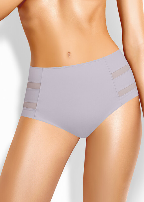 Трусы слипы с завышенной посадкой, сзади и сбоку бесшовная гладкая обработка, спереди декоративные горизонтальные вставки из плотной сетки, перед дублирован сеткой, по талии обработка с зигзагом и узкой резинкой.