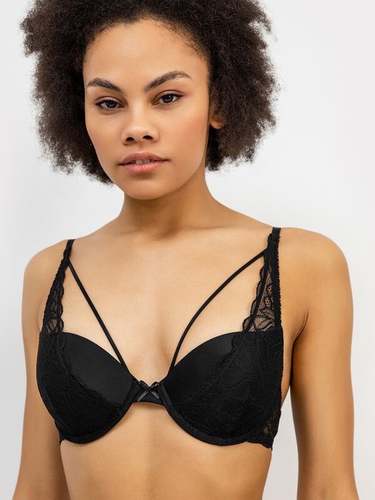 Обворожительный бюстгальтер с эффектом super push-up. Приподнимает и визуально увеличивает грудь, формируя соблазнительную зону декольте. Чашки формованные, на косточках. Модель украшена тонкой эластичной лентой, а боковые детали стана и чашки декорированы нежным кружевом. Настоящий хит!