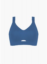 Бюстгальтер мягкий из эластичной сетки, без каркасов. Чашка с вытачкой. Низ обработан широкой бейкой из основного полотна с эластичной тесьмой внутри, с отделочной строчкой контрастными текстурированными нитками. Передний срез и проймы чашки обработаны с контрастной строчкой текстурированными нитями и жилкой по изнаночной стороне. Передняя часть бретели выворотная из основного полотна с жилкой внутри. Надставки бретелей по спинке из бретелечной тесьмы с регулировкой. Кольца-регуляторы. Застежка двойная.