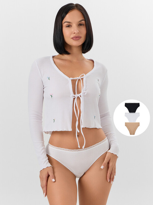 Мультипак из трех пар классических женских трусиков со средней линией талии. Выполнены из трикотажной рибаны – в рубчик. Вырхний срез украшен узким кружевом. Красиво и комфортно!