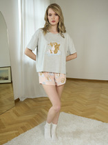 Пижама из трикотажной вискозы состоит из футболки и шорт. Укороченная футболка широкого покроя, с короткими рукавами.Короткие свободные шорты на широкой резинке.