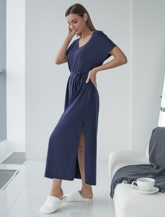 Длинное платье темно-синего цвета с V-вырезом из премиального 100% хлопка сочетает в себе легкость и благородный стиль. Женственный образ подчеркивает красивое декольте и тонкий пояс, который позволяет регулировать посадку по талии и создает А- силуэт. Модель украшена элегантным высоким разрезом сбоку, добавляющим свободы движению и нежности силуэту. Дышащий материал отлично подходит для теплой весны и лета, не теряет вида после длительного ношения, обеспечивая комфорт даже в жаркую погоду. Короткий цельнкроеный рукав добавляет свежести и удобства, делая платье универсальным для разных сезонов и случаев. Представленная широкая размерная линейка позволяет выбрать подходящий вариант для любой фигуры, в том числе и на большие размеры. Платье А-силуэта и длины макси подойдет девушкам и женщинам на низкий рост, а так же на высокий рост.
