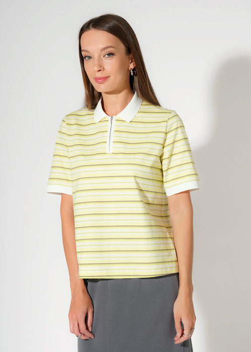 Джемпер - поло прямого силуэта из хлопкового трикотажного полотна . По горловине отложной вязаный воротник с планкой на молнии. Короткий втачной рукав. По низу рукава узкий вязаный манжет. Боковые разрезы.