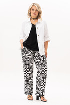 Брюки свободного силуэта, немного расширяются к низу. Пояс отрезной, с эластичной тесьмой внутри. По поясу проложены отделочные строчки.