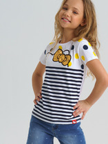 Футболка прямого силуэта. Перед и спинка цельнокроеные. Рукава втачные короткие. Нижние срезы рукавов с отворотами. Горловина круглой формы, обтачка из основного полотна. Шов притачивания обтачки закрыт бейкой из основного полотна. Низ изделия обработан на 2-х игольной плоскошовной машине швом в подгибку.